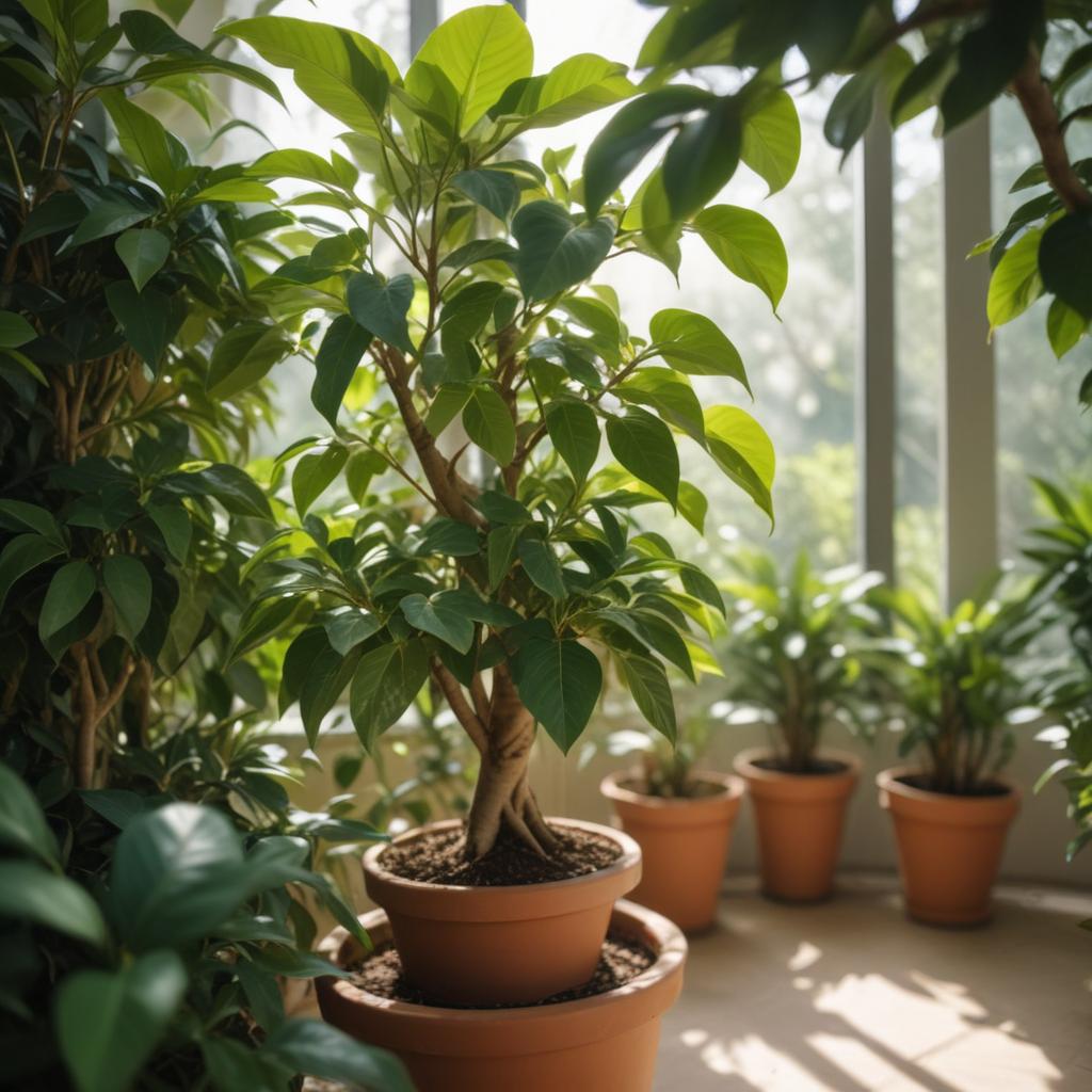 - Ficus benjamina — один из наиболее распространённых вариантов, отличается тонкой кроной и элегантной формой побегов; подходит для светлых помещений.